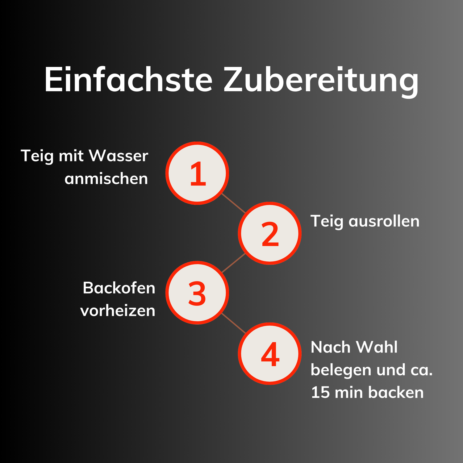 Nur Wasser hinzufügen: Einfach mit Wasser anmischen, Teig ausrollen und mit deinem Lieblings-Belag belegen. Im Backofen wie gewohnt backen.